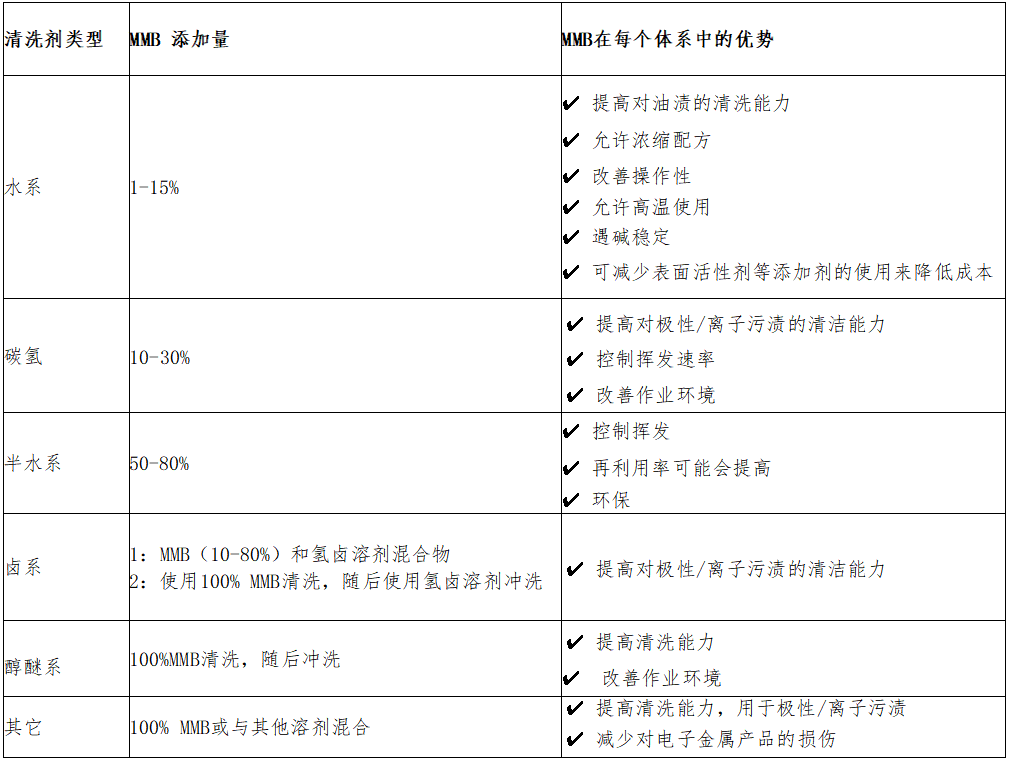 · 溶解力好:MMB表現出水油兩親性,適合用來清洗油污和離子污漬的混合物;